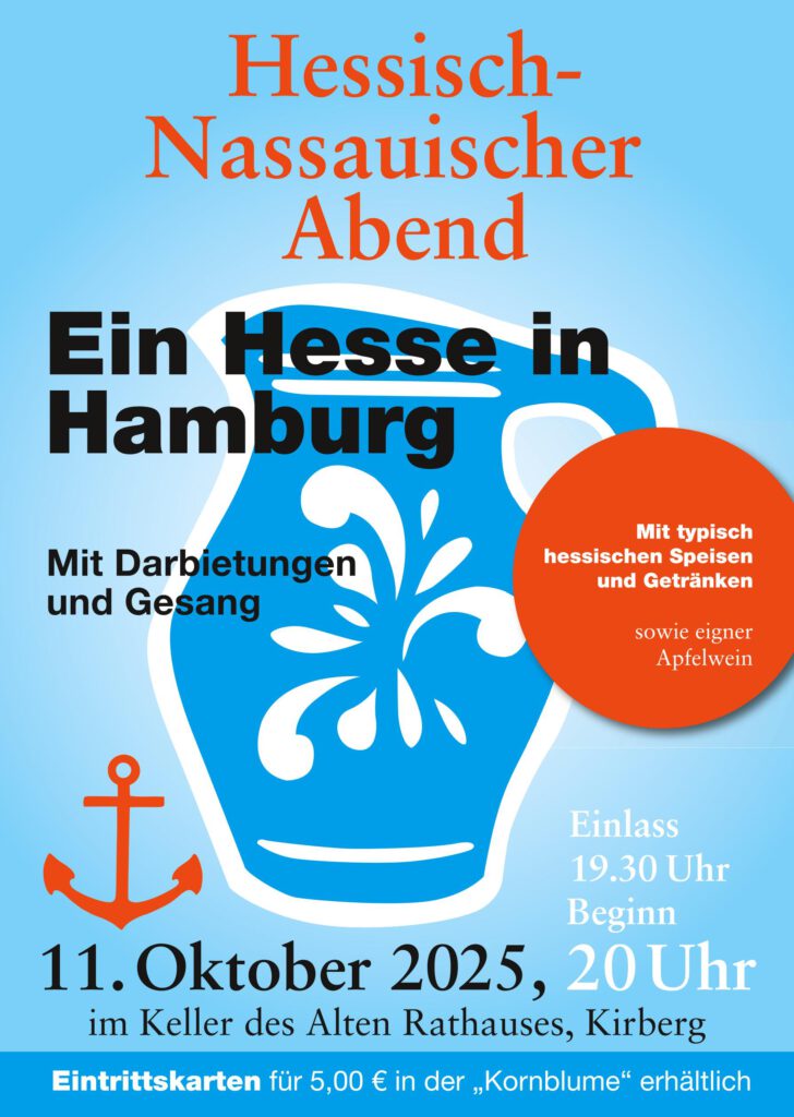 Die szenischen Darbietungen und die Lieder zum Mitsingen und Schunkeln sollen die Gäste hingegen nach Hamburg mitnehmen. Ganz nach dem Motto „Je platter das Land, desto höher das Niveau“ hat Arndt Preußer norddeutschen Humor, nostalgische Hafenatmosphäre und bekannte Seemannslieder zu einem launigen Programm zusammengestellt, das von Kirberger Originalen und mit musikalischer Begleitung auf dem Schifferklavier vorgetragen wird. Dazu servieren die Vereinsmitglieder hessische Spezialitäten wie Handkäs mit Musik‘