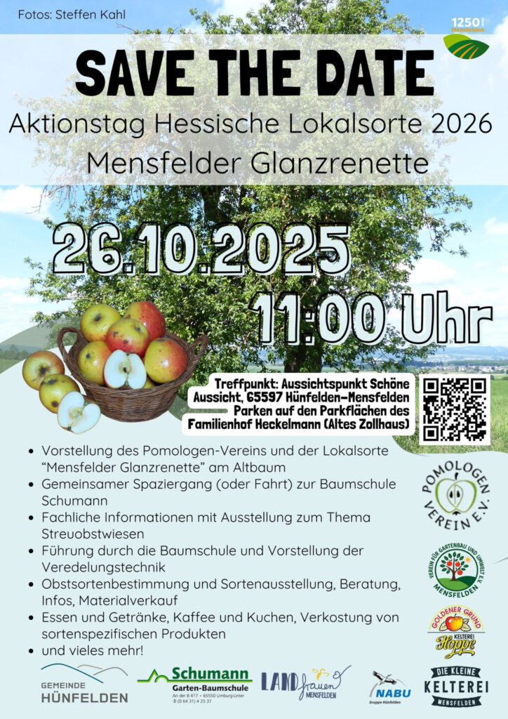 Eine Veranstaltung des Pomologen-Verein Hessen e.V. in Kooperation mit der Gemeinde Hünfelden, der Baumschule Schumann, den Landfrauen Mensfelden, der Kleinen Kelterei, Nabu Hünfelden, der Kelterei Hoppe Niederbrechen und des Vereins für Gartenbau und Umwelt Mensfelden.